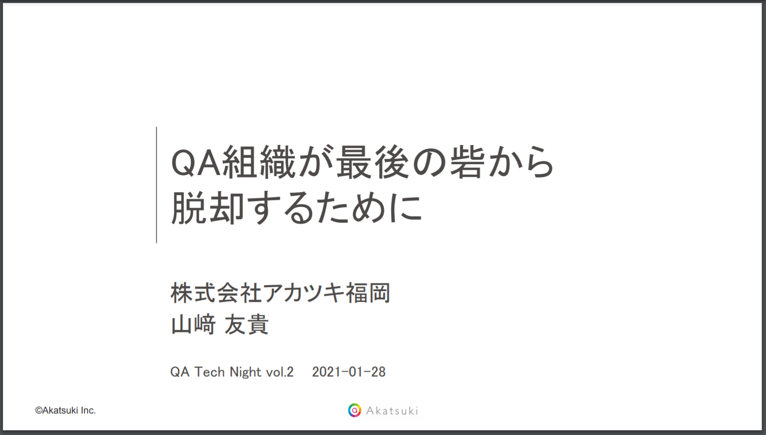 2021年1月28日、第2回目となるmonoAI tecnology〈現・AIQVE ONE)主催のオンラインセミナー、QA Tech Nightを開催いたしました。この記事では、その中で行われた株式会社アカツキ福岡の山﨑氏によるセッションの内容をお届けいたします。