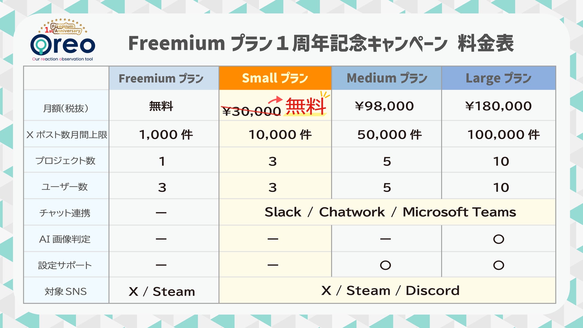 「Oreo」のFreemiumプラン提供開始から1周年を記念して、月額30,000円のSmallプランが無料でご利用いただけるキャンペーンを開催します。