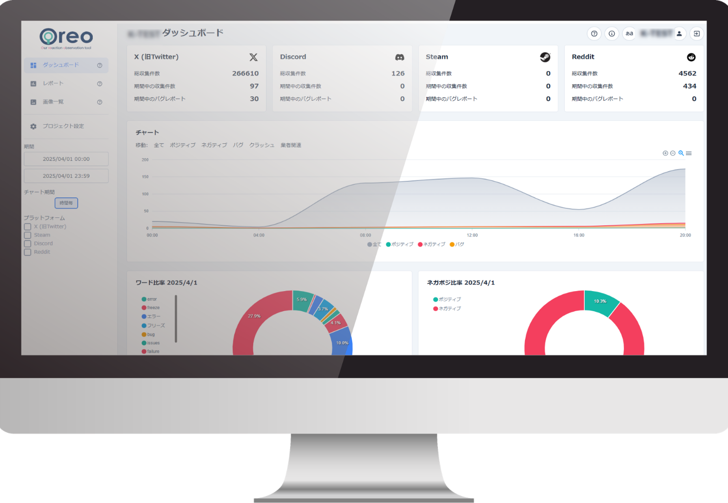 ダッシュボードから投稿数の推移を日/週単位でご確認いただけます。ポジティブ/ネガティブなキーワードをお客様が自由に登録し、比率をグラフで集計できます。X / Steam /Discord / Reddit の媒体別に閲覧も可能です。