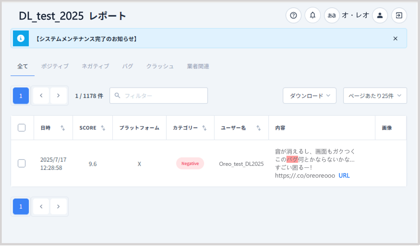 ポジティブ / ネガティブ / バグ報告 のジャンル別にレポートを集計します。お客様が登録したキーワードのスコア・重み付けによって分析結果が変動します。重要な投稿はチャットでリアルタイム通知されます。 対応チャットツール:Slack / Chatwork / Microsoft Teams