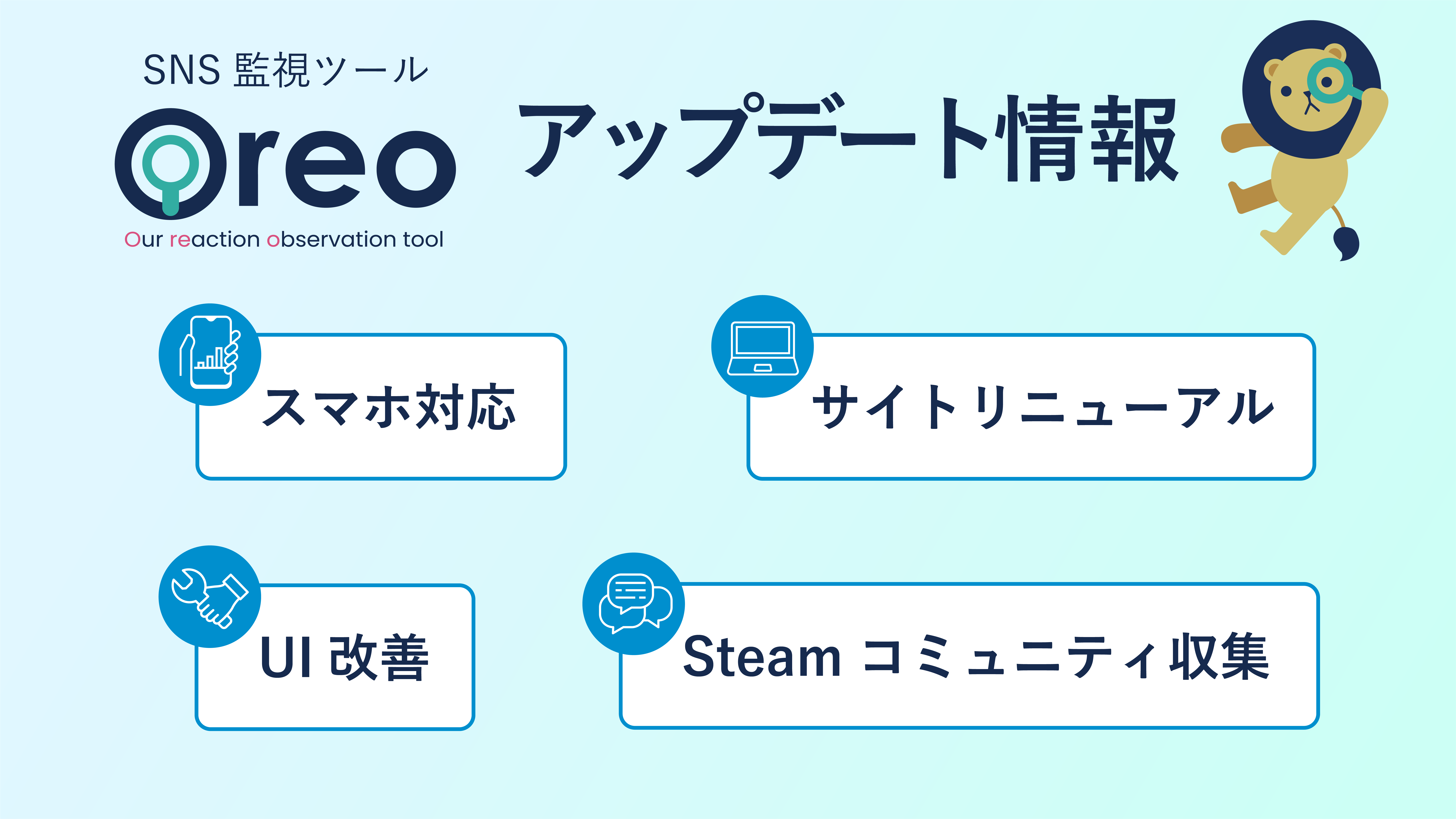 エゴサーチを自動化するSNS監視ツール「Oreo(オレオ)」の新機能を2025年11月11日にリリースしました。収集データの設定・確認がスマートフォンから操作可能になり、Steamはレビューだけでなくコミュニティの収集にも対応いたします。