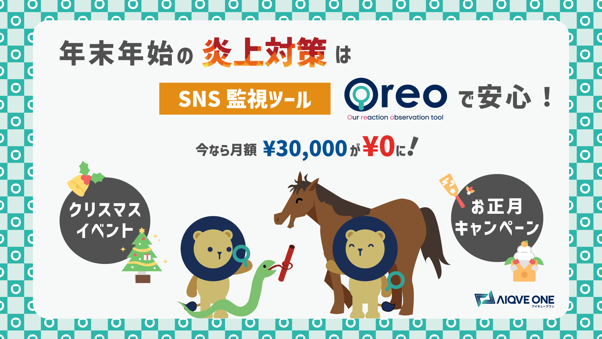 「クリスマス・年末年始のイベントやキャンペーン時に手が足りていない」「エゴサーチにまで人員が割けない」など、繁忙期のSNS運用にお困りの方向けにキャンペーンを開催いたします。ぜひこの機会に「Oreo」をお試しください。